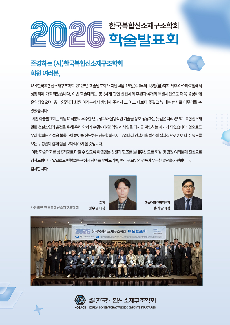 공지사항유관기관소식회원동정관련서식행사갤러리월간일정표 공지사항 2026 학술발표회 성료 감사 인사 관리자 / 2026-04-22 첨부파일 260421_한국복합신소재구조학회_2026 학술발표회_감사장.pdf 이전글 학술발표회 기간 사무국 업무안내 다음글 다음글이 없습니다. 목록